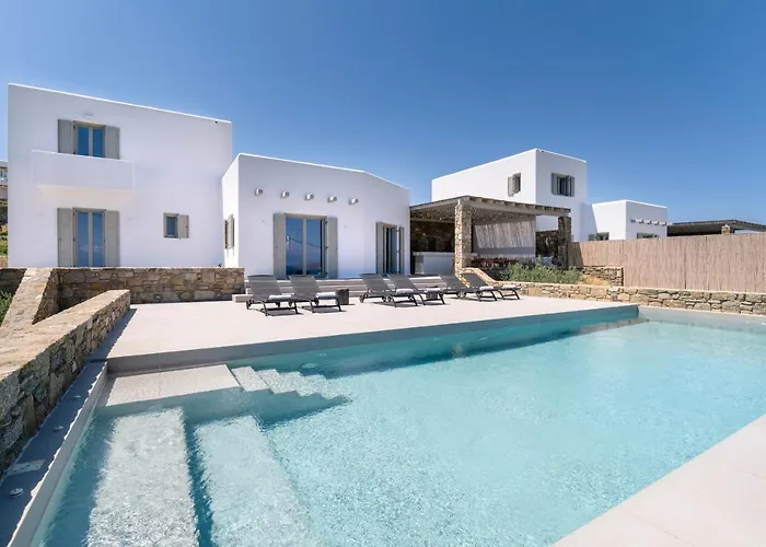 La villa New - Villa Apiro - Mg Villas Mykonos está ubicada a 15 minutos en coche del Aeropuerto Nacional de Míconos. Las instalaciones de ocio incluyen tumbonas y un jardín así como windsurf, esnórquel y equitación.